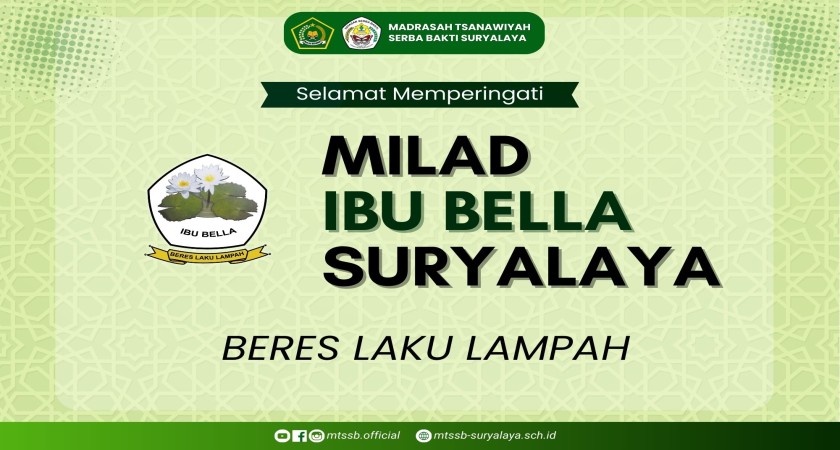 Keluarga besar MTs Serba Bakti Pontren Suryalaya menyampaikan ucapan Dirgahayu Ibu BELLA Pondok Pesantren Suryalaya ke-59. Semoga Ibu BELLA semakin maju, modern, dan bermanfaat serta senantiasa berada dalam naungan barokah dan karomah Guru Mursyid, Syekh KH. Abdullah Mubarok bin Nur Muhammad RA dan Syekh KH. Ahmad Shohibulwafa Tajul Arifin RA.