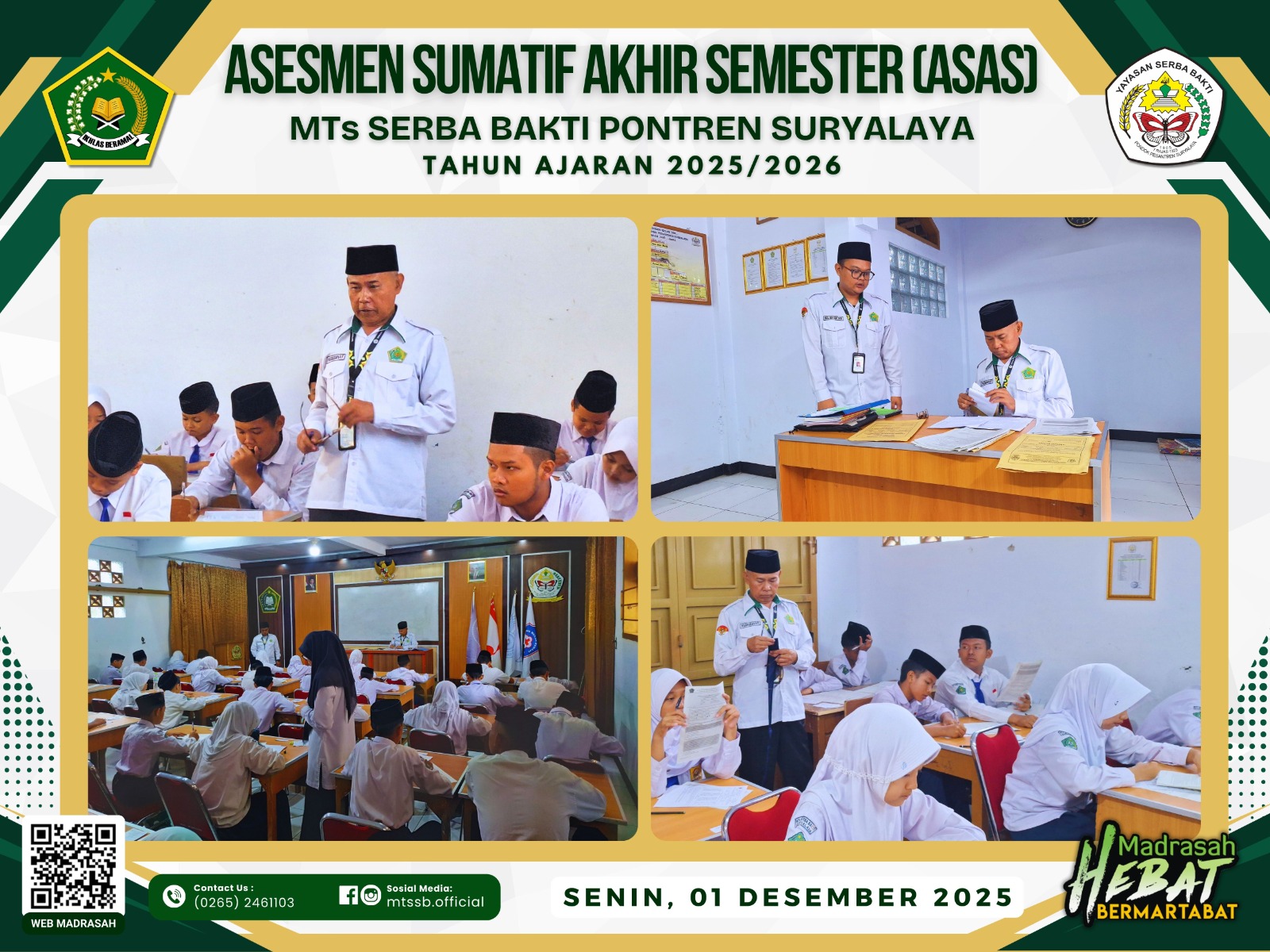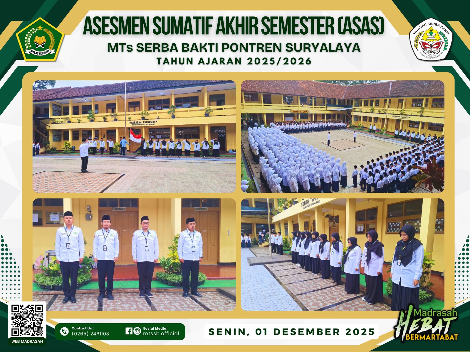 MTs Serba Bakti Pontren Suryalaya berkomitmen menyelenggarakan ASAS sebagai bentuk evaluasi pembelajaran yang bermutu, transparan, dan berorientasi pada peningkatan kompetensi siswa. Diharapkan rangkaian ASAS yang berlangsung hingga 06 Desember 2025 dapat menjadi sarana bagi peserta didik untuk menunjukkan kemampuan dan meraih hasil terbaik.