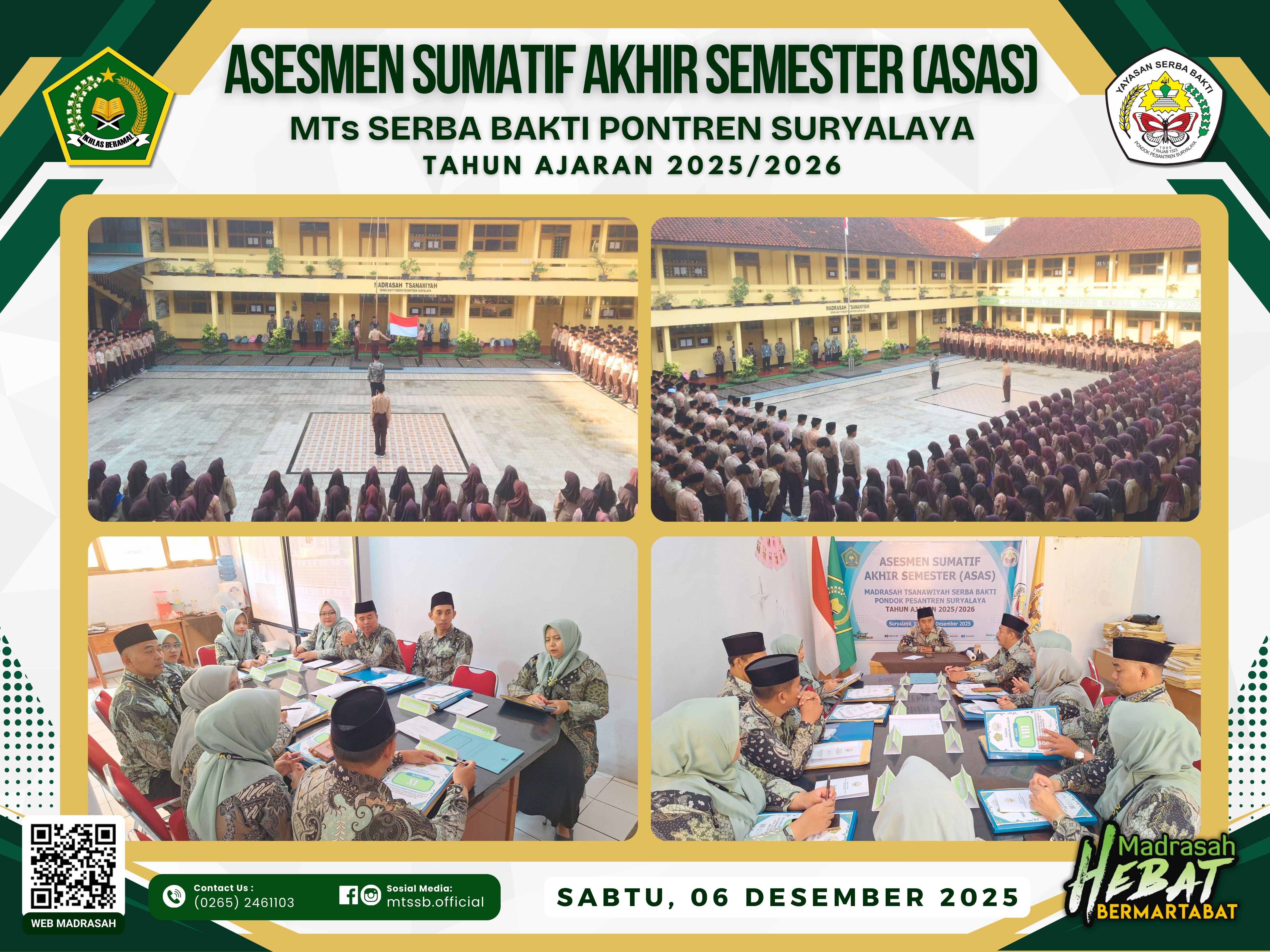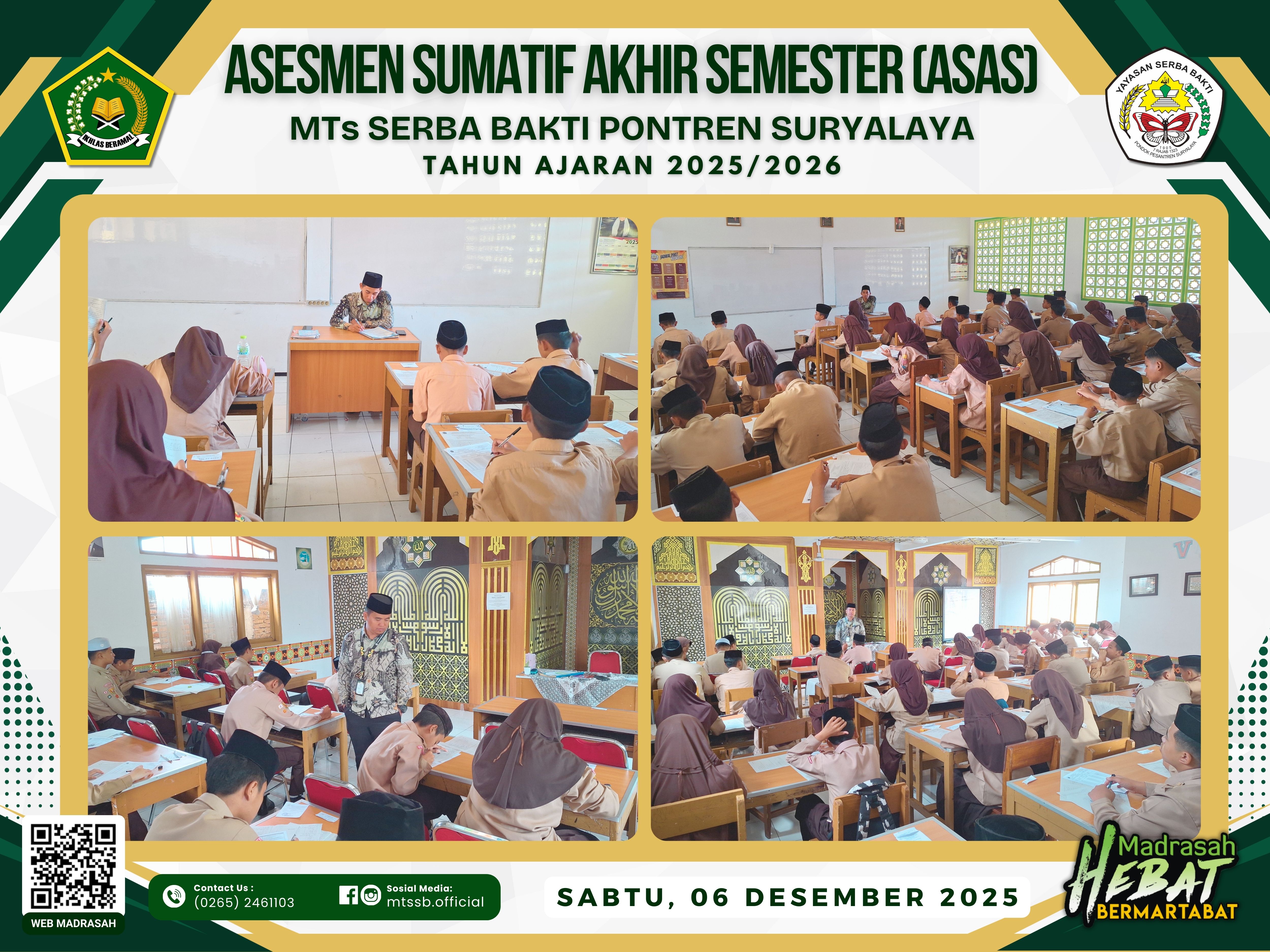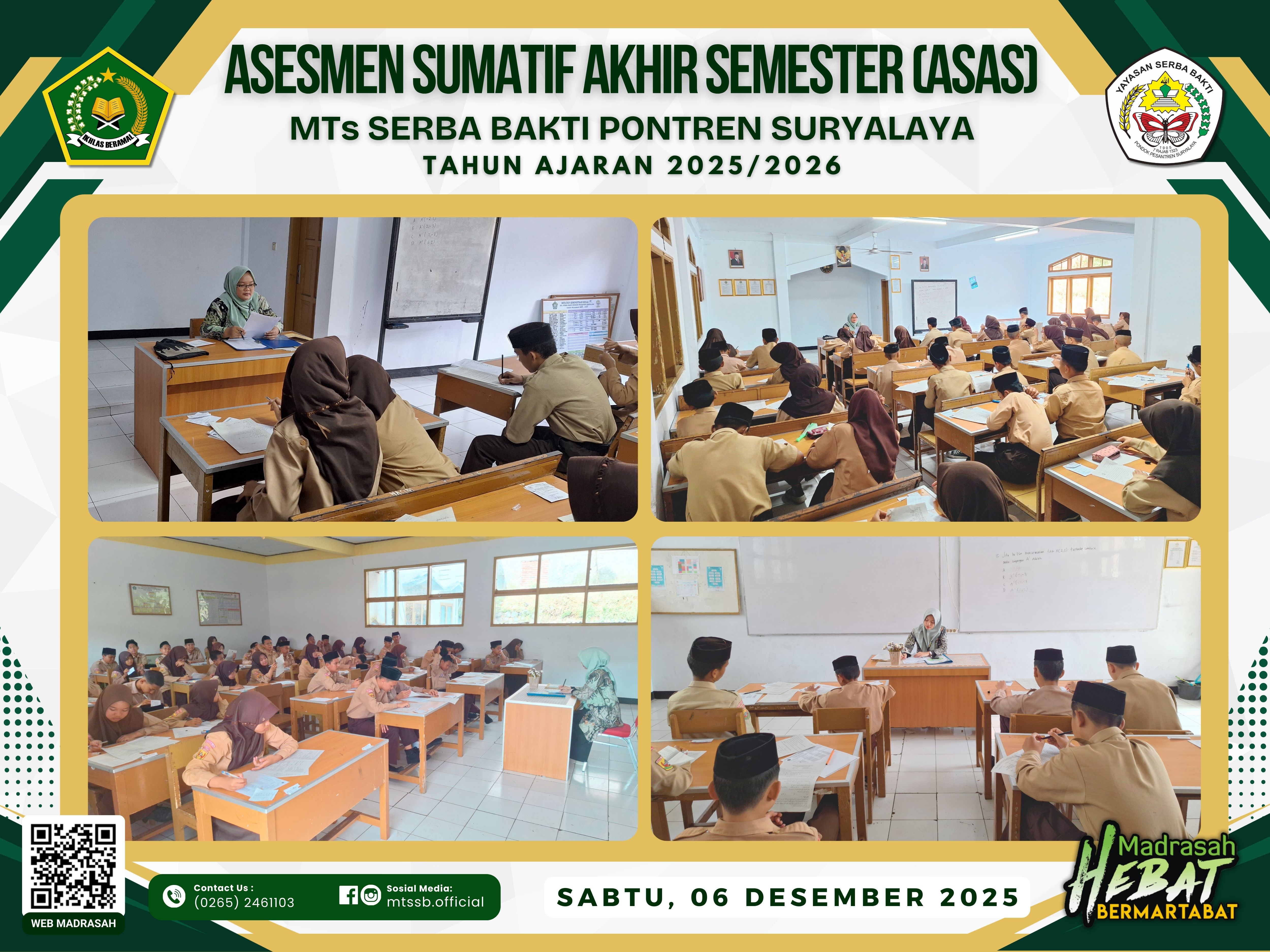 SURYALAYA - Sabtu, 07 Desember 2025. Pelaksanaan Asesmen Sumatif Akhir Semester (ASAS) hari keenam di MTs Serba Bakti Pontren Suryalaya menjadi penutup rangkaian ujian semester ganjil Tahun Ajaran 2025/2026. Pada hari terakhir ini, peserta didik mengikuti tiga mata pelajaran yaitu Bahasa Arab, Pendidikan Kewarganegaraan (PKn), dan Ilmu Pengetahuan Sosial (IPS). Ketiga mata pelajaran tersebut diujikan secara berurutan dengan pengawasan ketat dari guru pengawas di setiap ruang ujian.