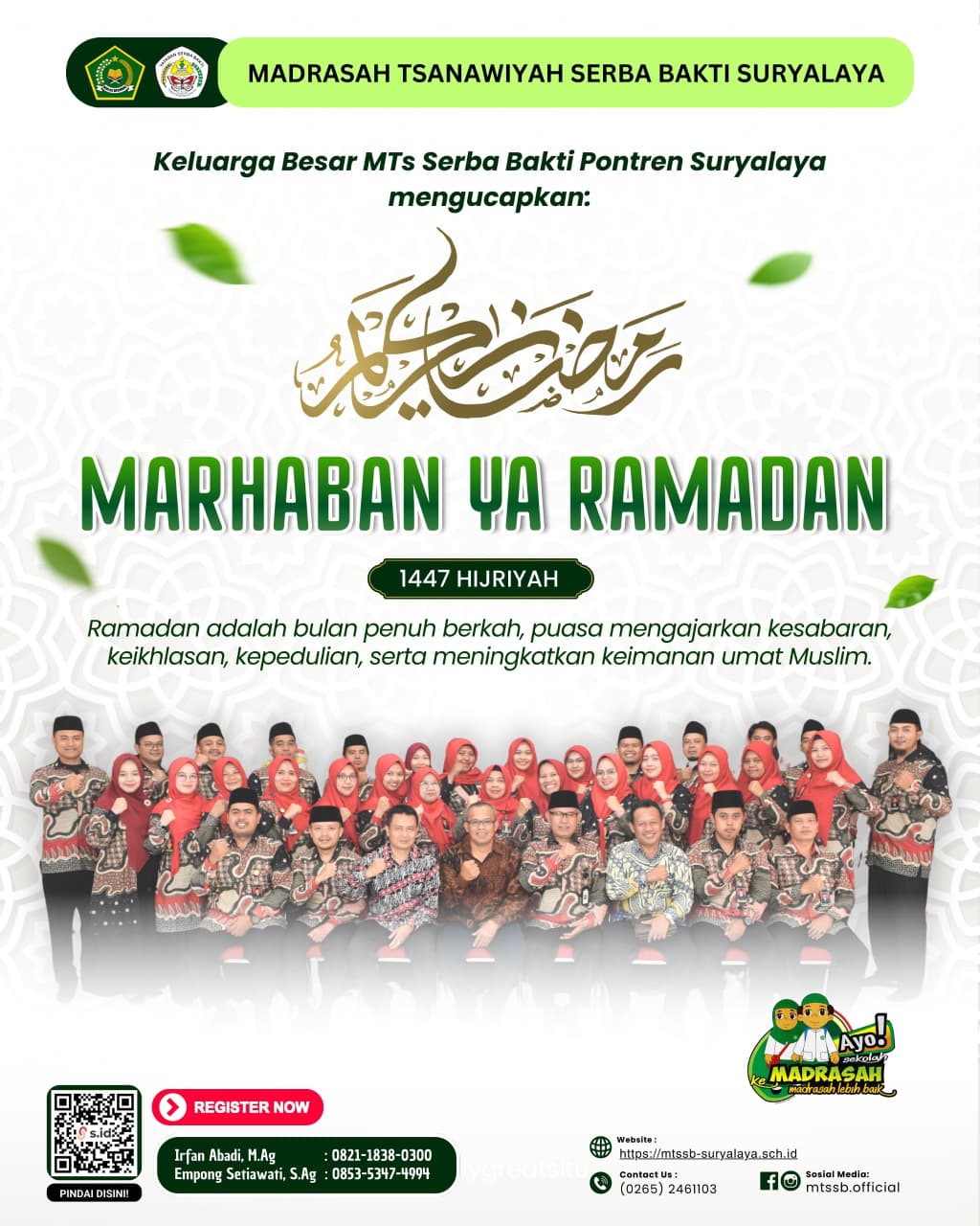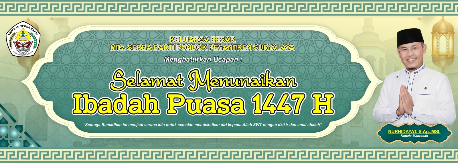 Kami, Keluarga Besar MTs Serba Bakti Pondok Pesantren Suryalaya, mengucapkan Selamat Menunaikan Ibadah Puasa. Mari kita jadikan momentum bulan suci ini untuk meningkatkan ketaatan, memperdalam ilmu, dan mengamalkan Tanbih dengan penuh keikhlasan.