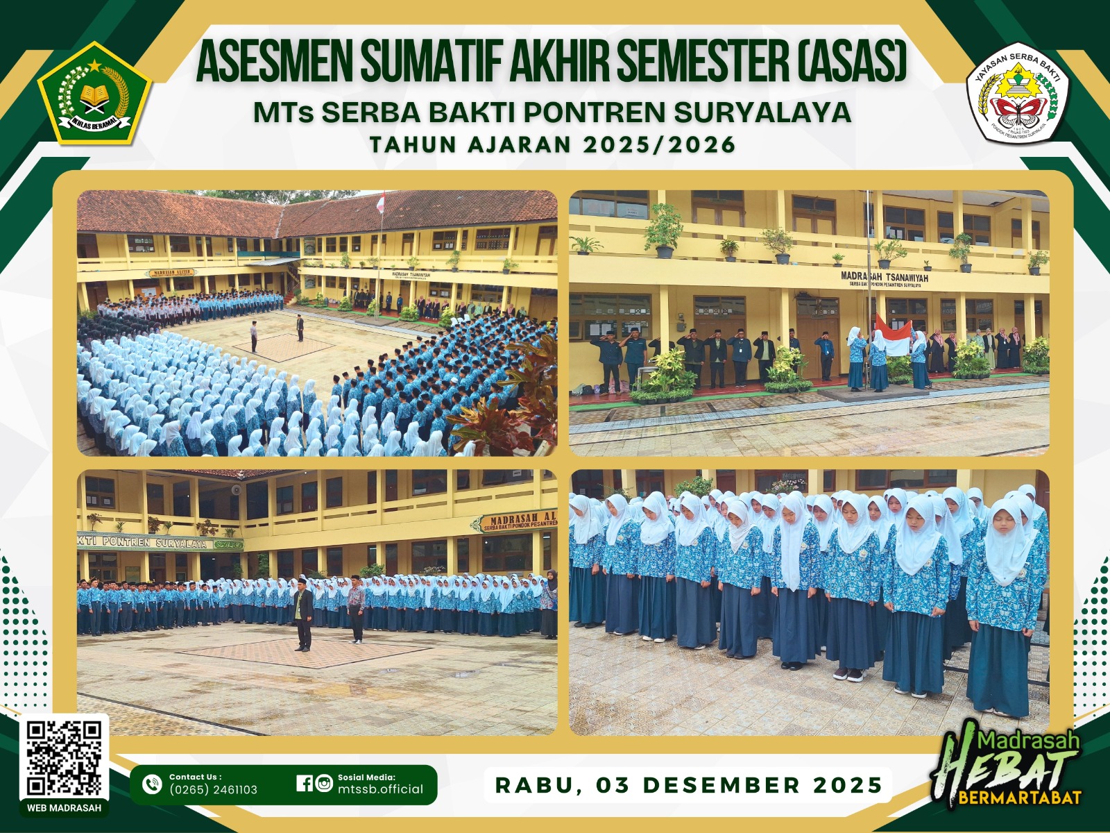 MTs Serba Bakti Pontren Suryalaya berharap pelaksanaan ASAS pada hari-hari berikutnya dapat terus berlangsung dengan lancar dan tertib. Madrasah juga mengingatkan peserta didik untuk tetap menjaga kesehatan, istirahat cukup, dan menyiapkan diri dengan baik agar dapat memperoleh hasil yang maksimal.