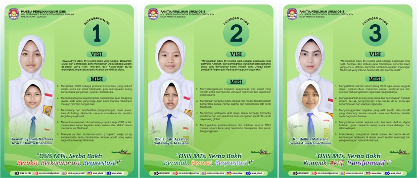 Seluruh pasangan calon telah melalui tahapan seleksi dan masa kampanye selama dua minggu. Dalam tahapan tersebut, masing-masing paslon memaparkan visi, misi, serta program kerja unggulan di hadapan seluruh murid MTs Serba Bakti.