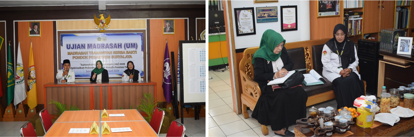 Sebagai bagian dari pelaksanaan pengawasan, Pengawas Pembina dari Kementerian Agama Kabupaten Tasikmalaya, Ibu Mimin Aminah, M.Pd., juga melaksanakan monitoring lanjutan serta pengisian buku tamu di ruang Kepala Madrasah. Kegiatan ini tidak hanya bersifat administratif, tetapi menjadi bagian dari proses evaluasi langsung terhadap pelaksanaan Ujian Madrasah di MTs Serba Bakti Pontren Suryalaya.