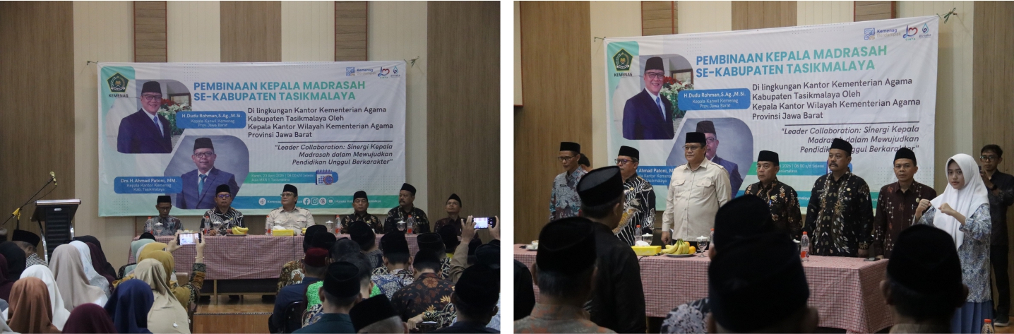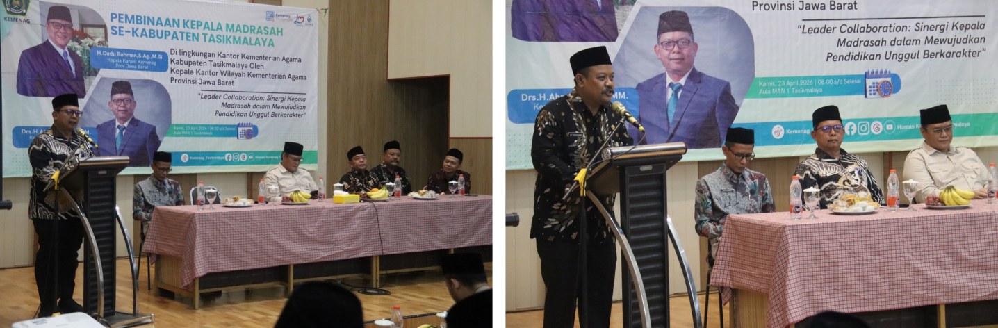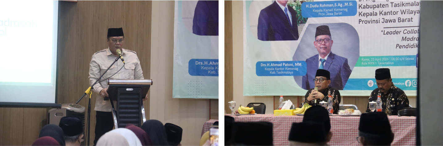 Kepala Kantor Kementerian Agama Kabupaten Tasikmalaya, Drs. H. Ahmad Patoni, MM., dalam sambutannya menyampaikan bahwa kegiatan ini menjadi momentum penting dalam meningkatkan kualitas kepemimpinan dan tata kelola madrasah, beliau juga berharap seluruh peserta dapat mengambil nilai-nilai strategis yang disampaikan untuk diterapkan di satuan pendidikan masing-masing, tak lupa beliau menyampaikan aspirasi para kepala madrasah, kepada Pak Kanwil agar memperhatikan dan dapat membantu perbaikan dan peningkatan infrastruktur madrasah di Kabupaten Tasikmalaya, yang disambut dengan applause dari peserta pembinaan.