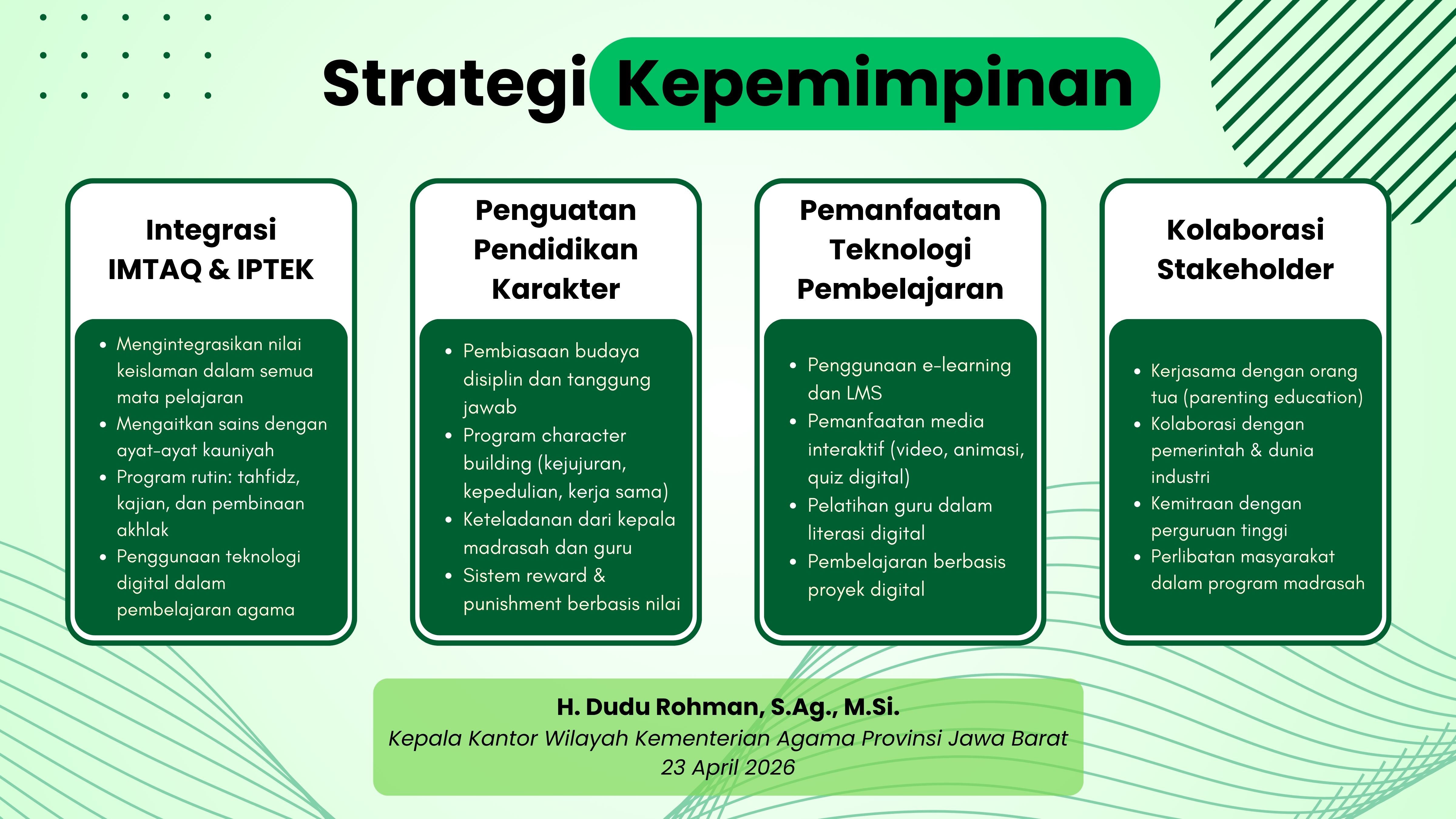 Menghadapi Tantangan Global Pendidikan, perlu melakukan Inovasi Pendidikan Madrasah, antara lain penguatan leader collaboration kepala madrasah, menerapkan blended learning dan e-learning, kurikulum berbasis kompetensi, integrasi tahfidz dan sains, pengembangan soft skills, Kang Dudu menutup presentasi dengan closing presentasi dengan penguatan bahwa “Kepemimpinan madrasah harus mampu beradaptasi dengan perkembangan zaman tanpa meninggalkan nilai-nilai keislaman. Madrasah harus menjadi pusat lahirnya generasi yang unggul, berkarakter, dan siap bersaing di tingkat global”, tegasnya.